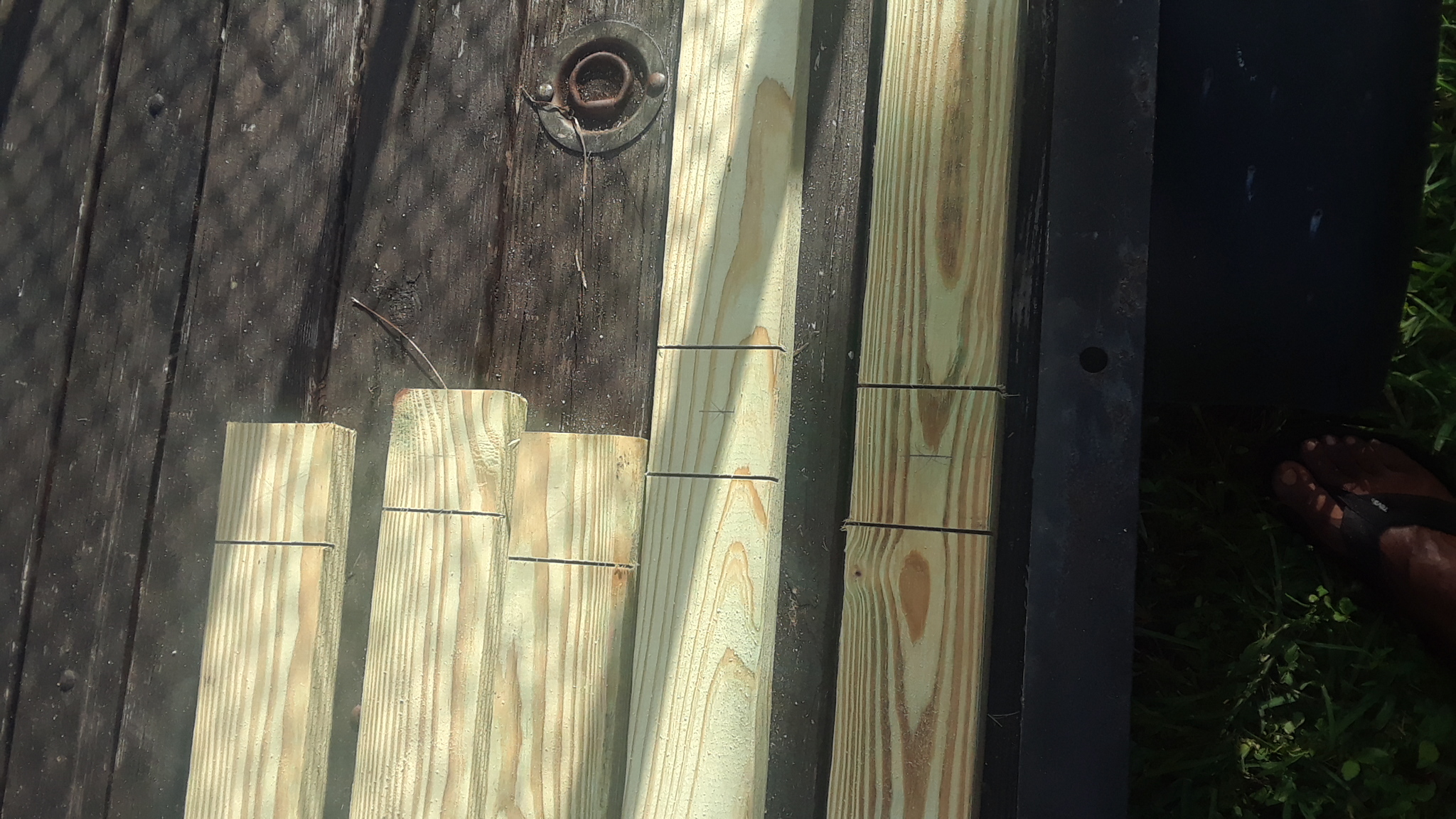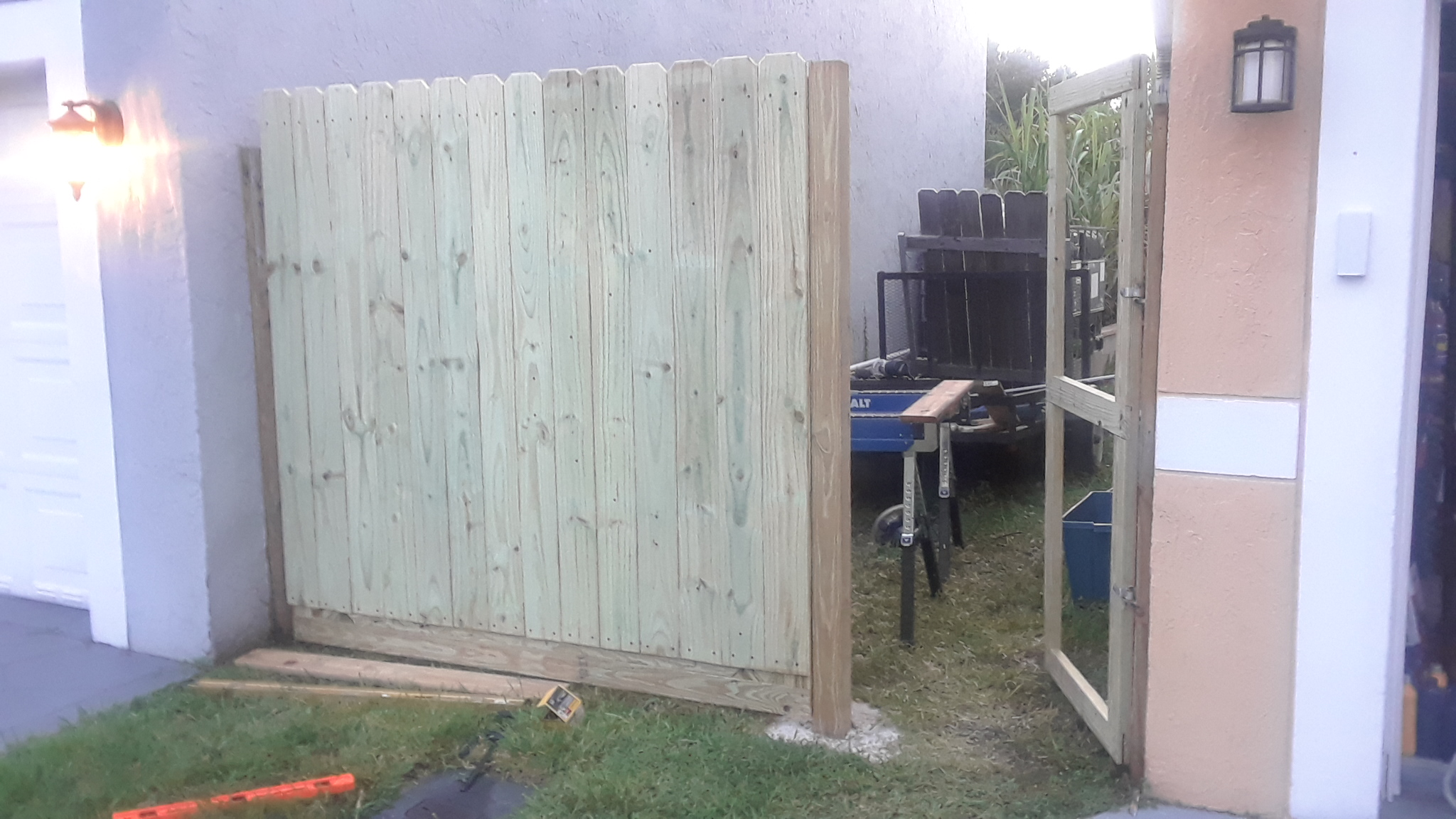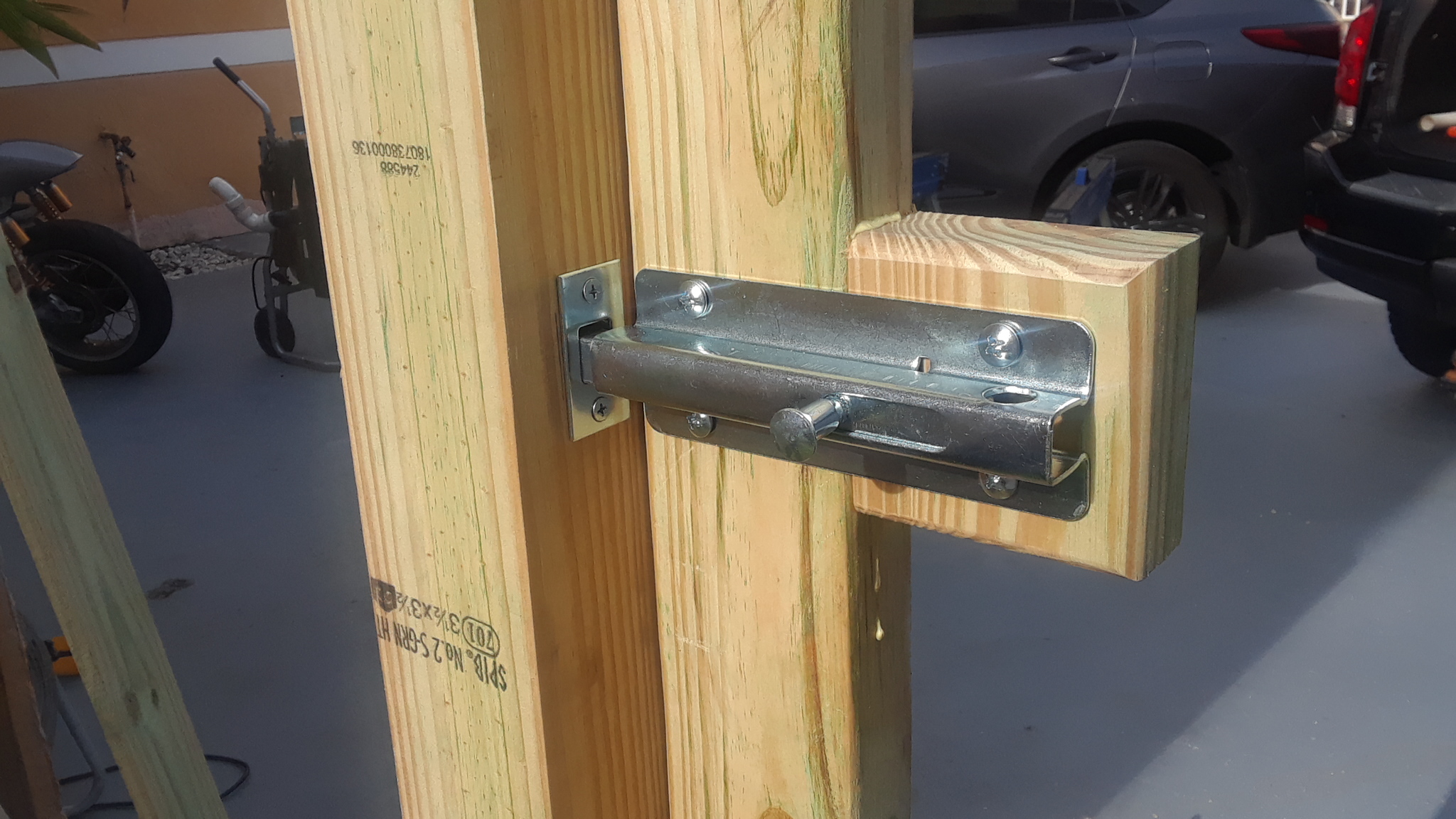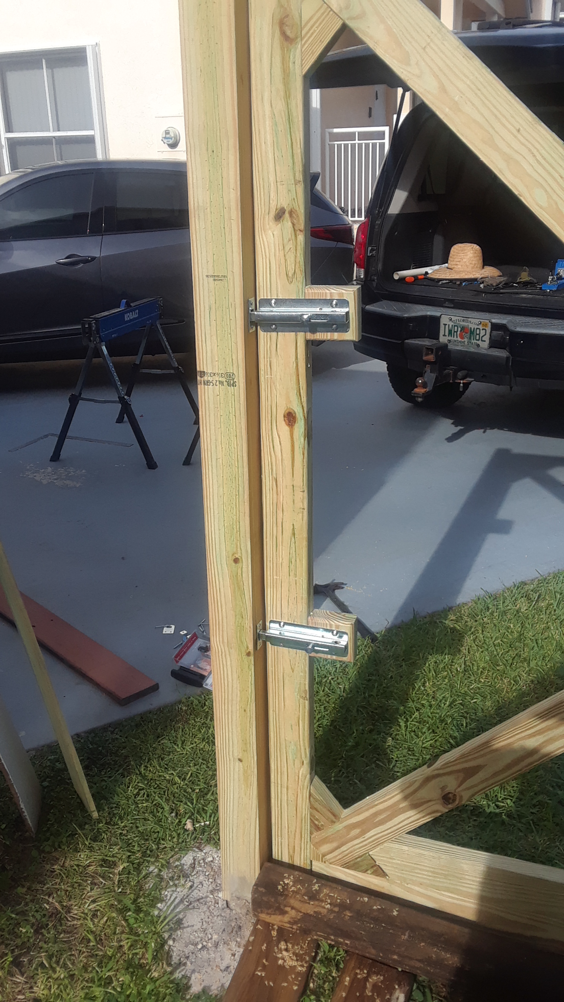 I reused the gate hinge hardware, which I should have replaced with a differently style of hinge, which would open fully and flush. Because of this style of hinge, I was left with a large gap, which is needed for the gate to open fully. I spent a lot of time trimming an notching the end boards, to allow for the necessary clearance, then adding an overlapping board on hinges and magnets to close fully.