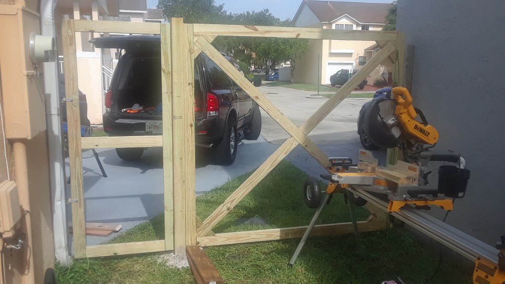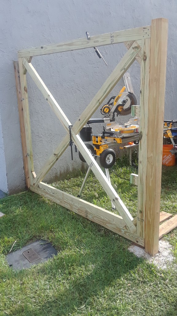 I did not take into consideration the length of running the X brace on the large gate, would exceed the length of the 2×4’s which I purchased for this build. Because they were a few inches short, I needed to brace the corners with 3 little triangle pieces, pocket hole screwed together, to create the proper brace.