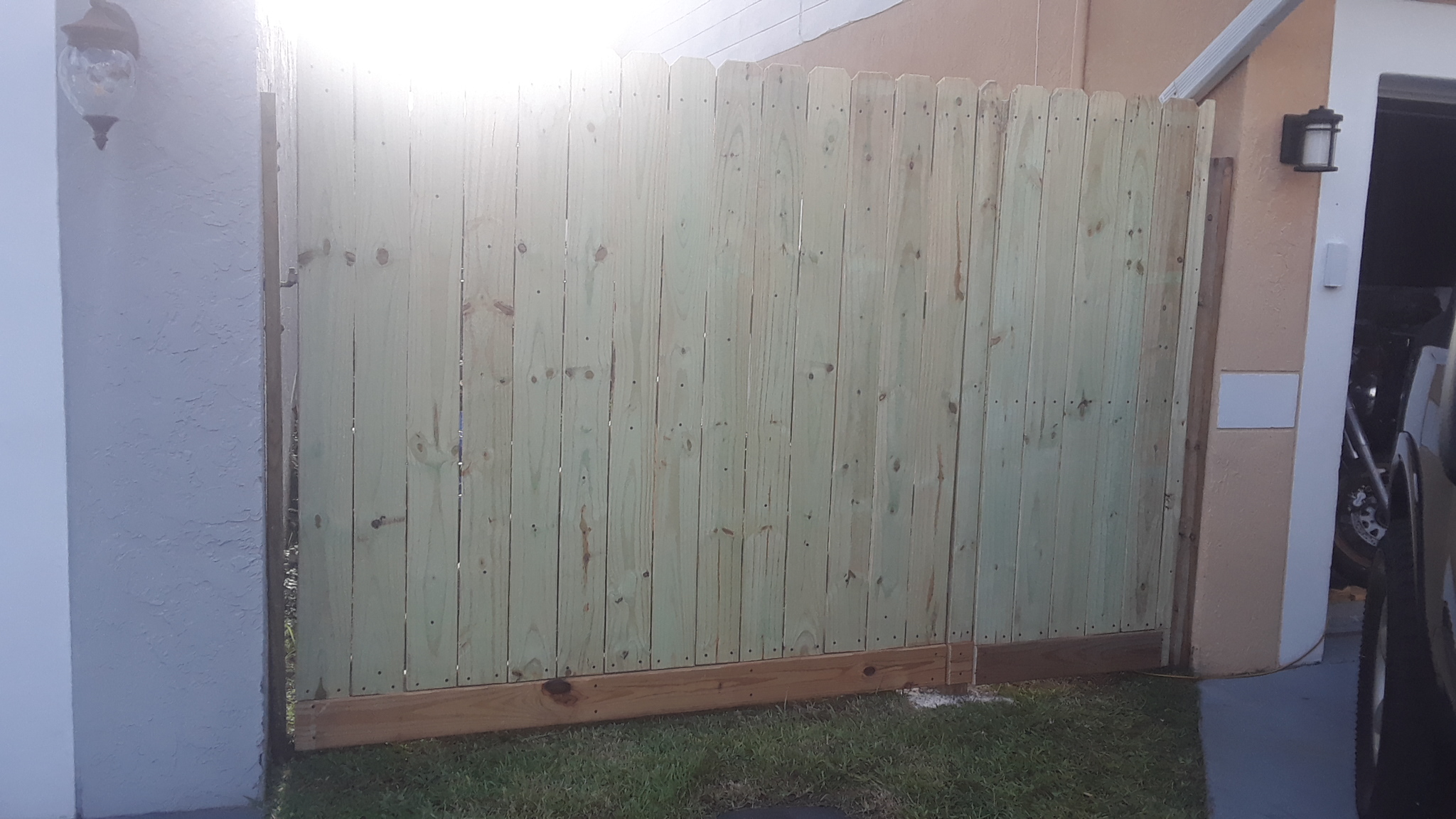 I used a horizontal deck board spanning the bottom of the gate. My reasoning for this is to raise the gate creating more privacy and the thickness of this type of board will hold up better to the damage caused by the weed trimmer which caused my last gate boards to rot prematurely. If there is damage to this board, I can simply unscrew and replace it if needed.