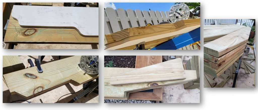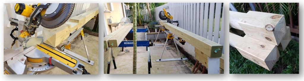 I made a decorative template, which I intended to use for the ends of the beams. I clamped the template to the underside of the beam and used a 3” flush trim bit to trace along the template. I purchased this bit for this project and upon my first use, the bearing spun off, and I gouged the beam to an unusable point. Takeaway: try out new bits and tools on scrap pieces. I ended up salvaging the beam by taking a straight cut to the width of the posts and saving as much as I could. This option ultimately worked better as there was less cutting. I am pleased with the final product as this style looks much more modern than the curved end pieces. I used the offcut of the beams to cut the rafters to match