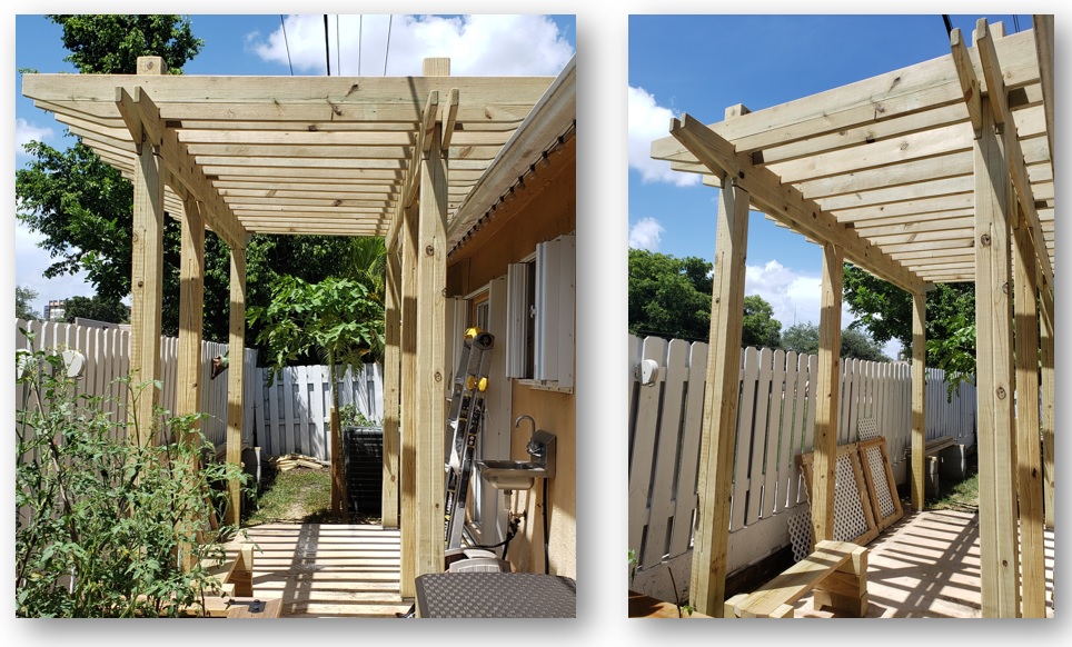 A pergola is different from a pergoda in that the roof is open to the elements, not providing coverage. I chose to go with a pergola over a pergoda as I intend to train vine plants up and along the structure. While the slats do provide some shade from the sun at the right angle, most of the light will still pass through.