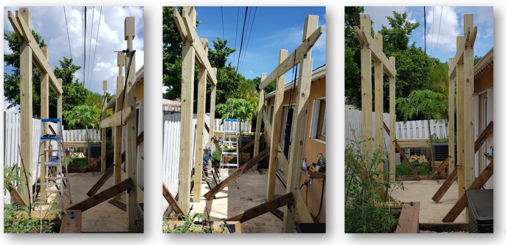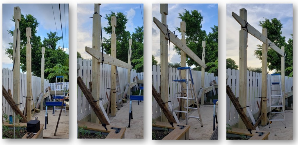 Repeating the process on the other side, while using braces on the posts until I tie in the top rafters. Its starting to look like something now!