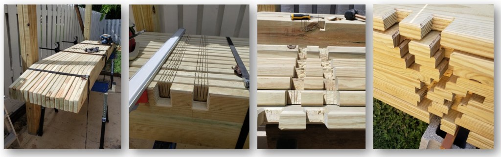 I started by quickly planning any high spots and marking out the shoulders on all 3 pieces, then running the circular saw to create the reliefs for the notches to accept the beams.